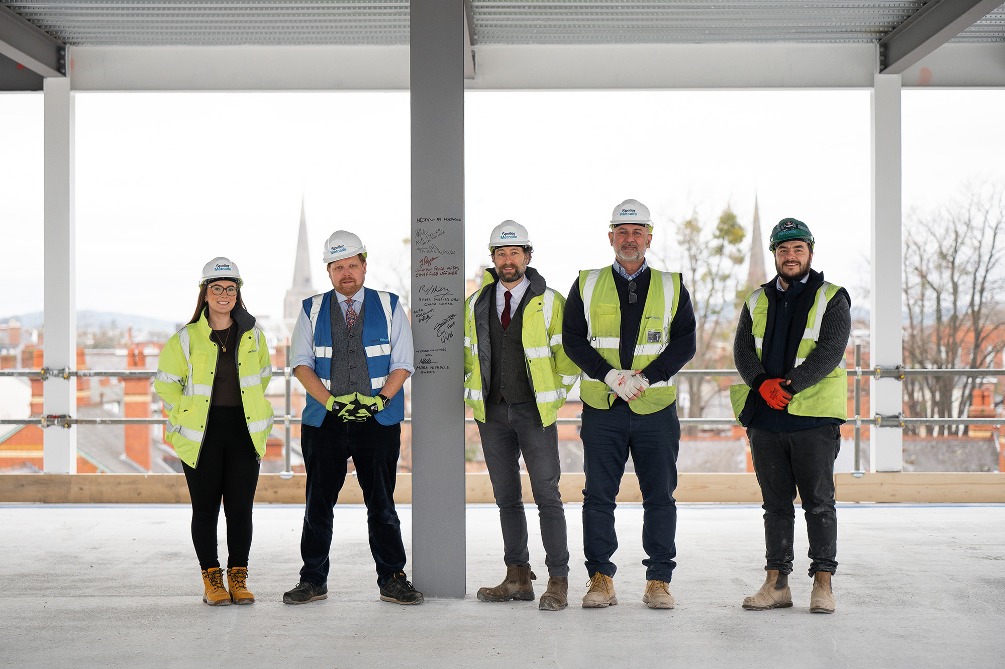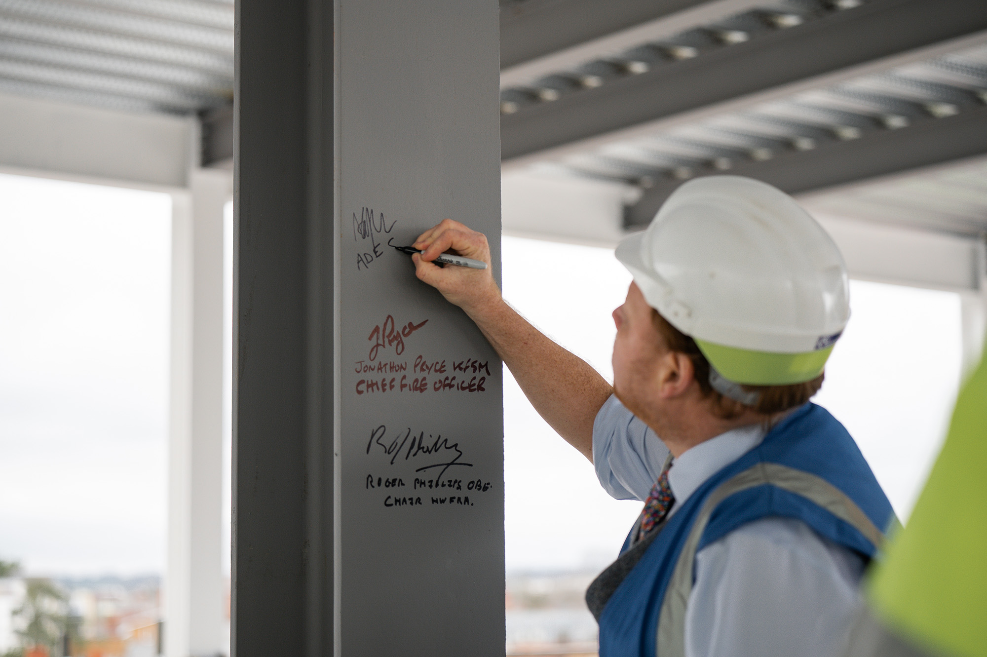 Chief Fire Officer Jon Pryce KFSM, Assistant Chief Fire Officer Ade Elliott and Councillor Roger Phillips OBE, Chair of the Fire Authority, joined the Speller Metcalfe project team, along with Speller Metcalfe’s Managing Director, Adrian Speller, and Regional Director, Mark Hudgeon, to sign one of the final steel beams.